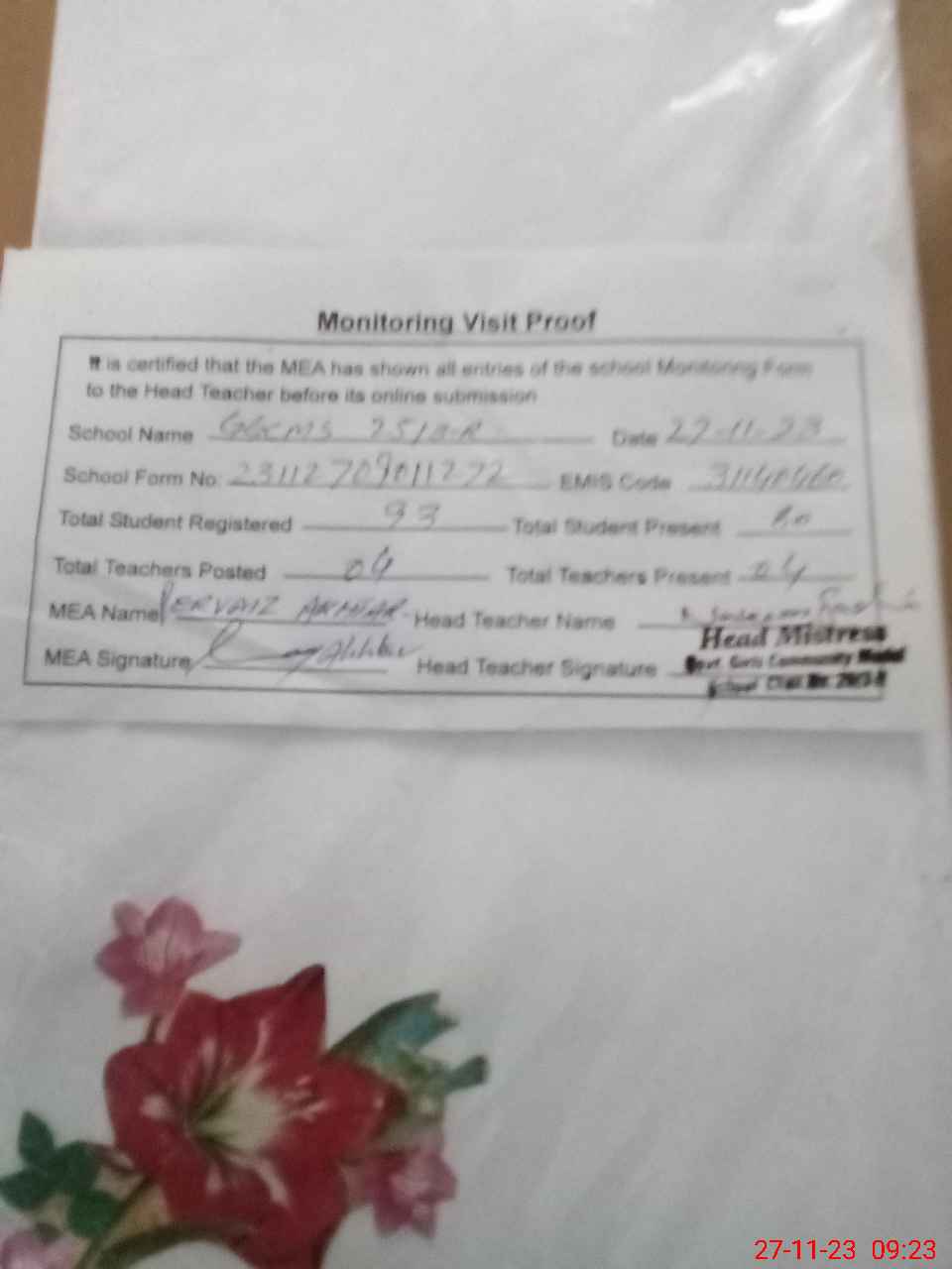 | Attendance Register | Head Teacher | MEA with School | Visit Proof |