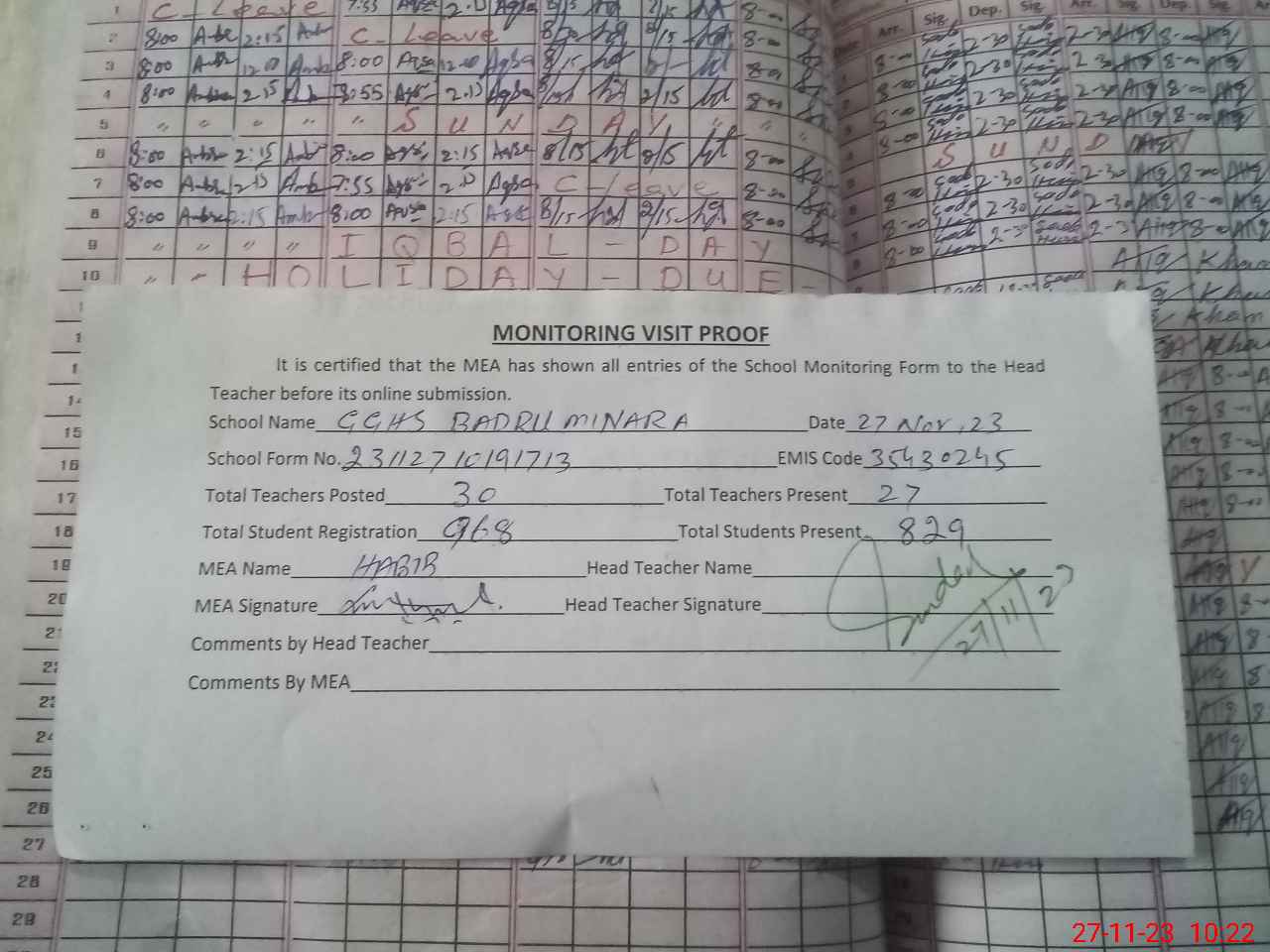 | Attendance Register | Head Teacher | MEA with School | Visit Proof |