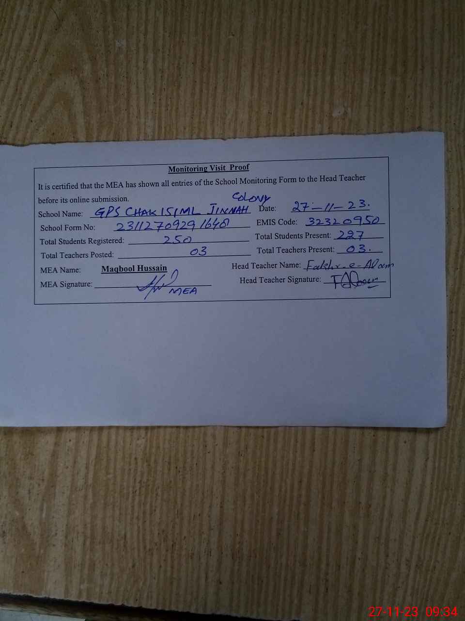 | Attendance Register | Head Teacher | MEA with School | Visit Proof |