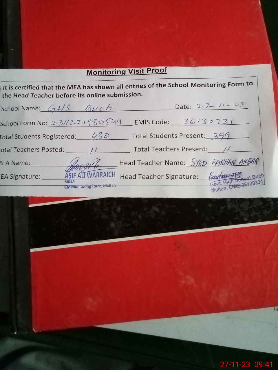 | Attendance Register | Head Teacher | MEA with School | Visit Proof |