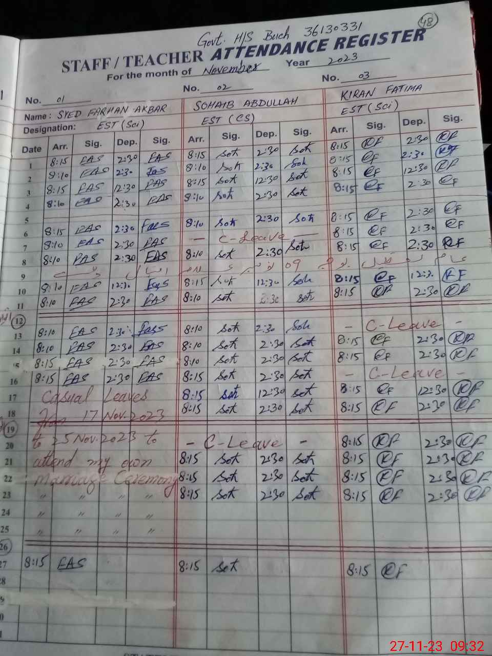 | CNIC | Full Name | Designation | R/C | Absence During Last Calender Month |
