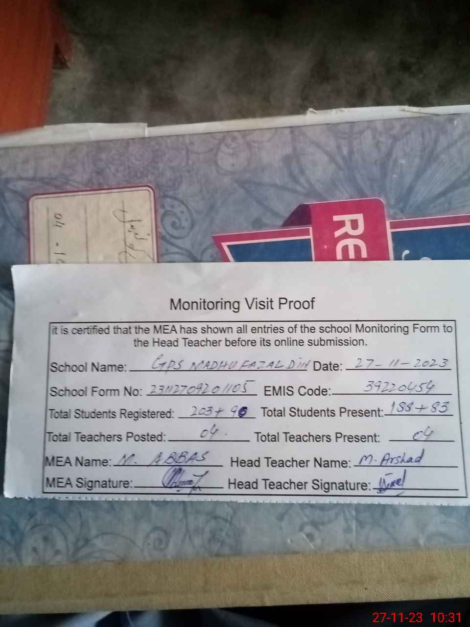 | Attendance Register | Head Teacher | MEA with School | Visit Proof |