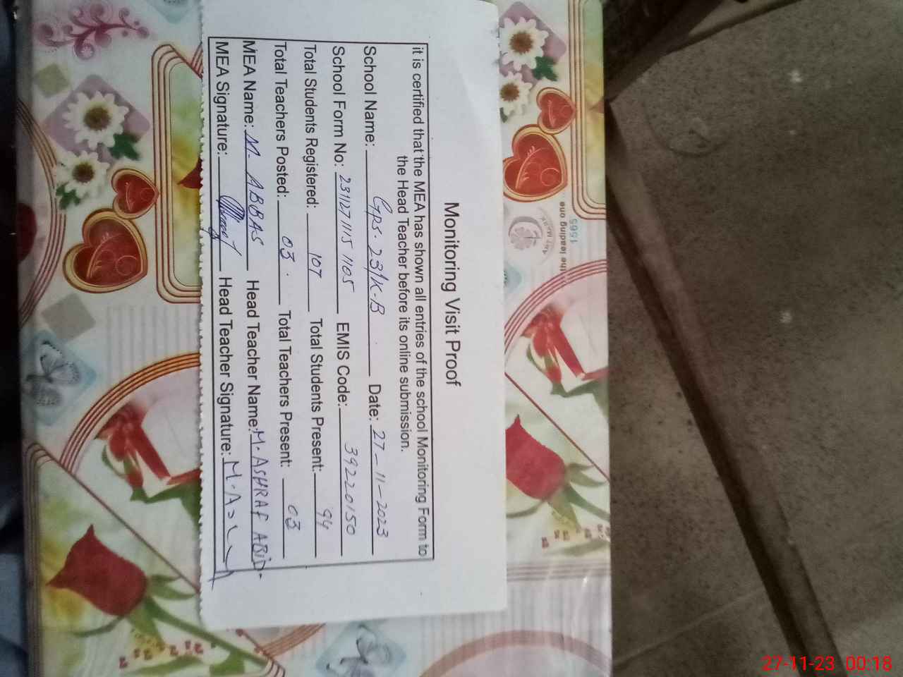 | Attendance Register | Head Teacher | MEA with School | Visit Proof |