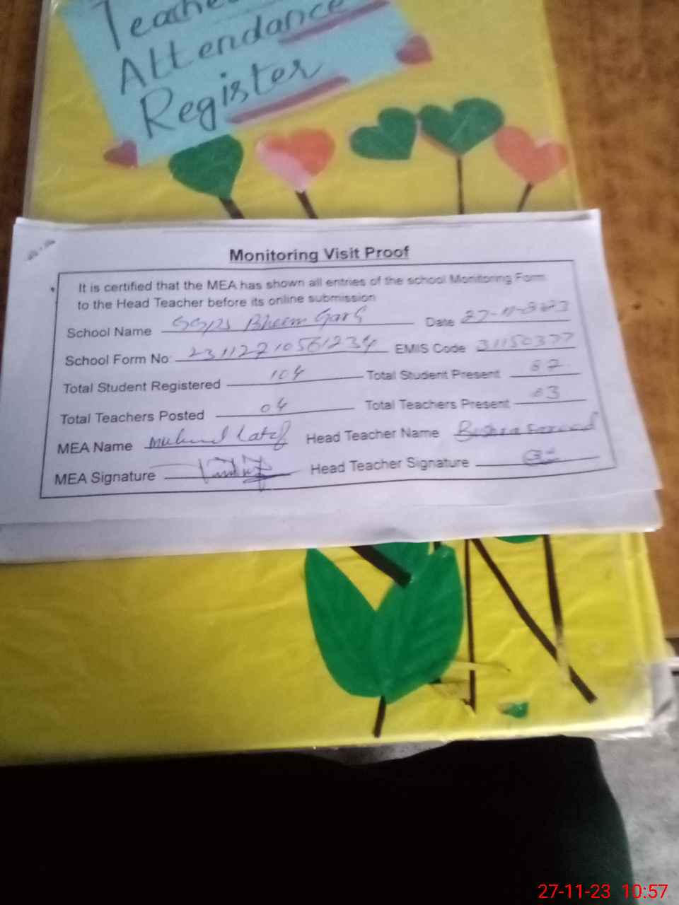 | Attendance Register | Head Teacher | MEA with School | Visit Proof |