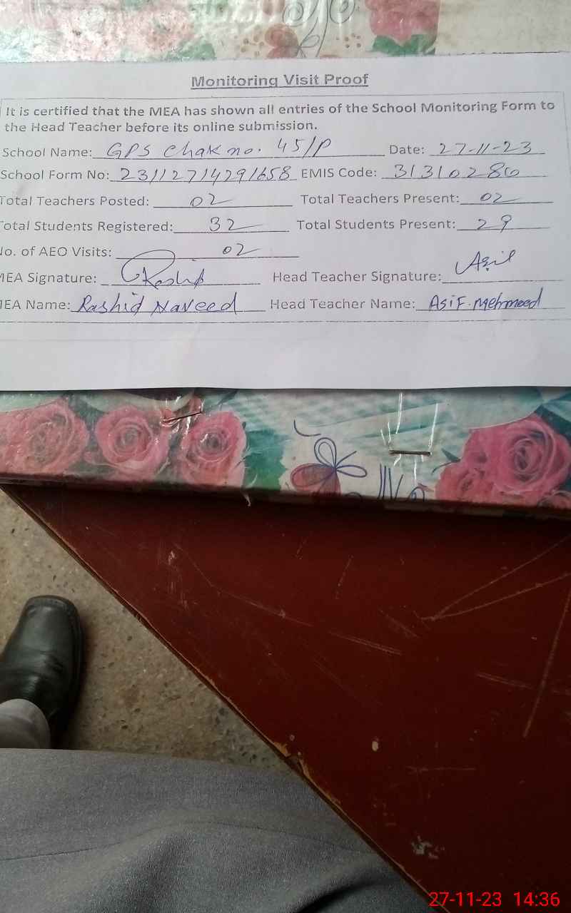 | EMIS Code: 31310280 | Name of School: GPS CHAK NO. 45/P | |||