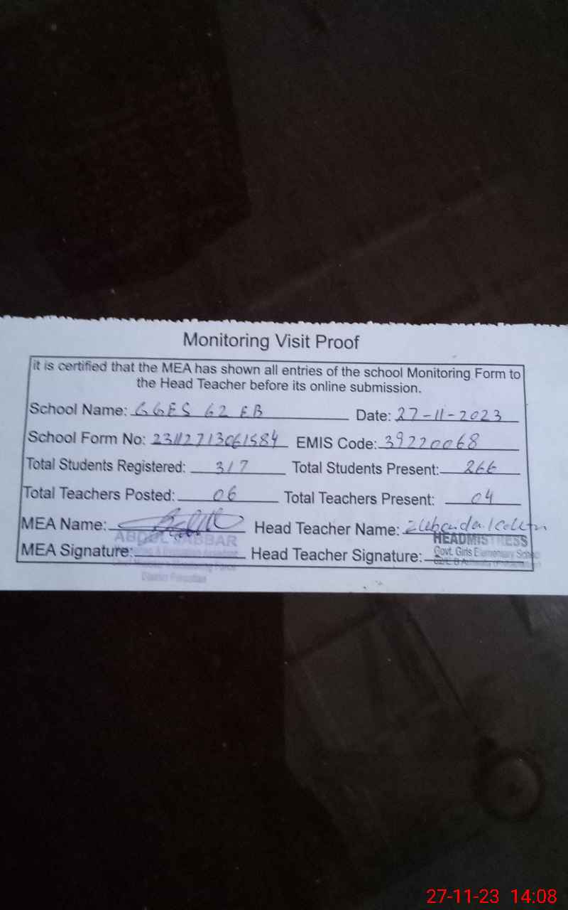 | Attendance Register | Head Teacher | MEA with School | Visit Proof |