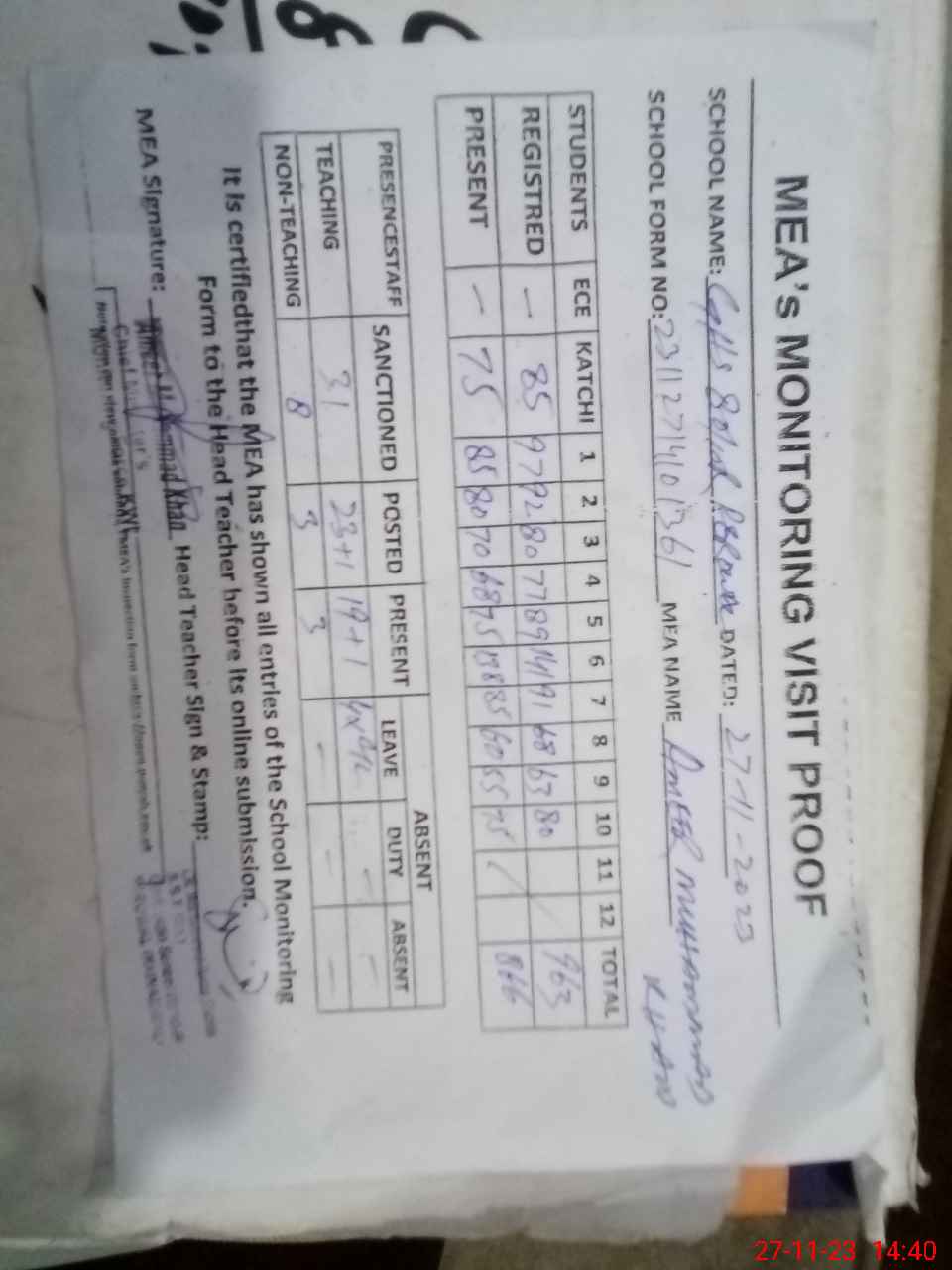 | Attendance Register | Head Teacher | MEA with School | Visit Proof |