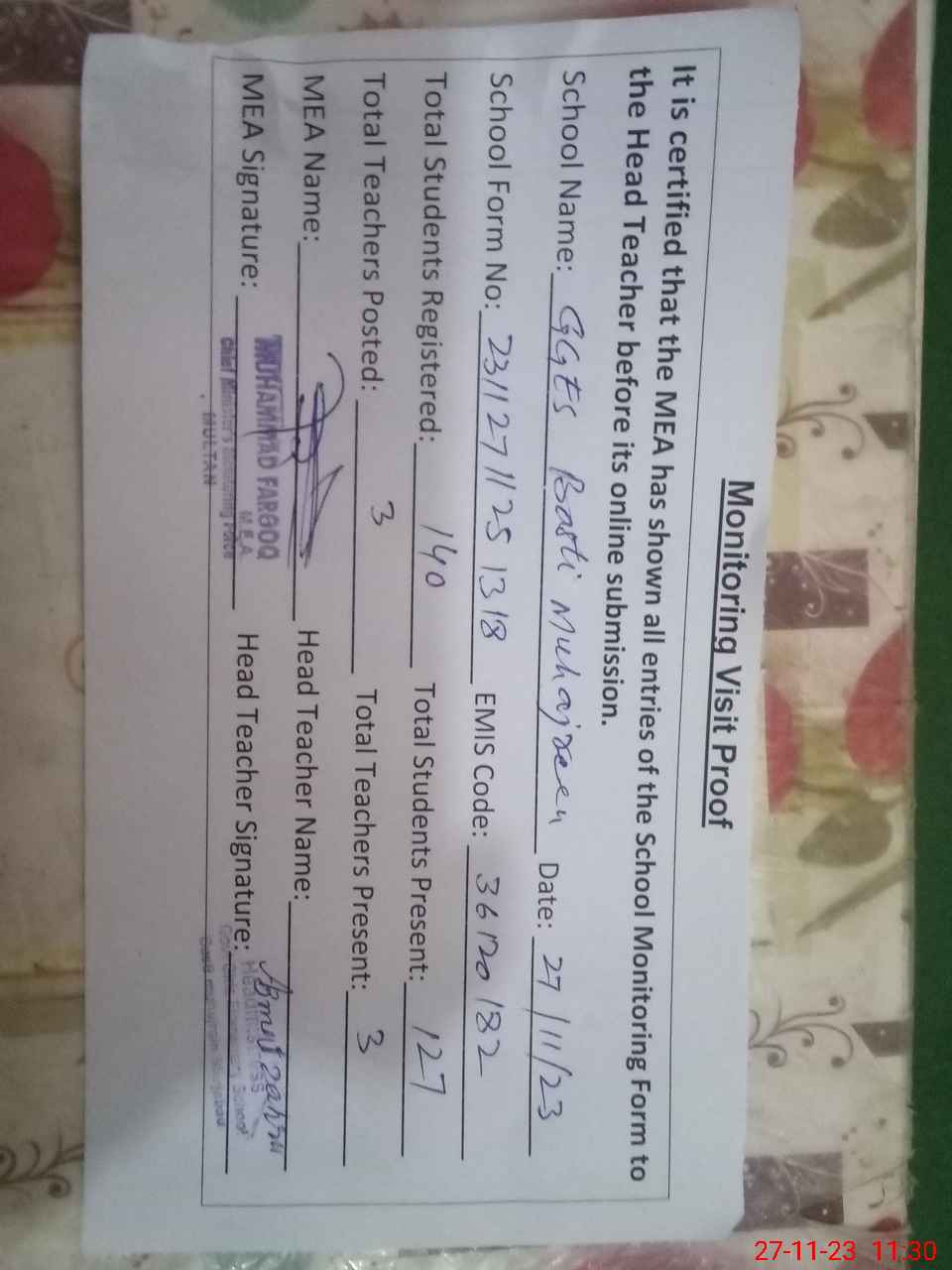 | Attendance Register | Head Teacher | MEA with School | Visit Proof |