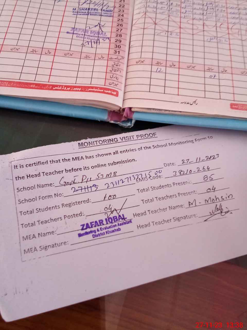 | Attendance Register | Head Teacher | MEA with School | Visit Proof |