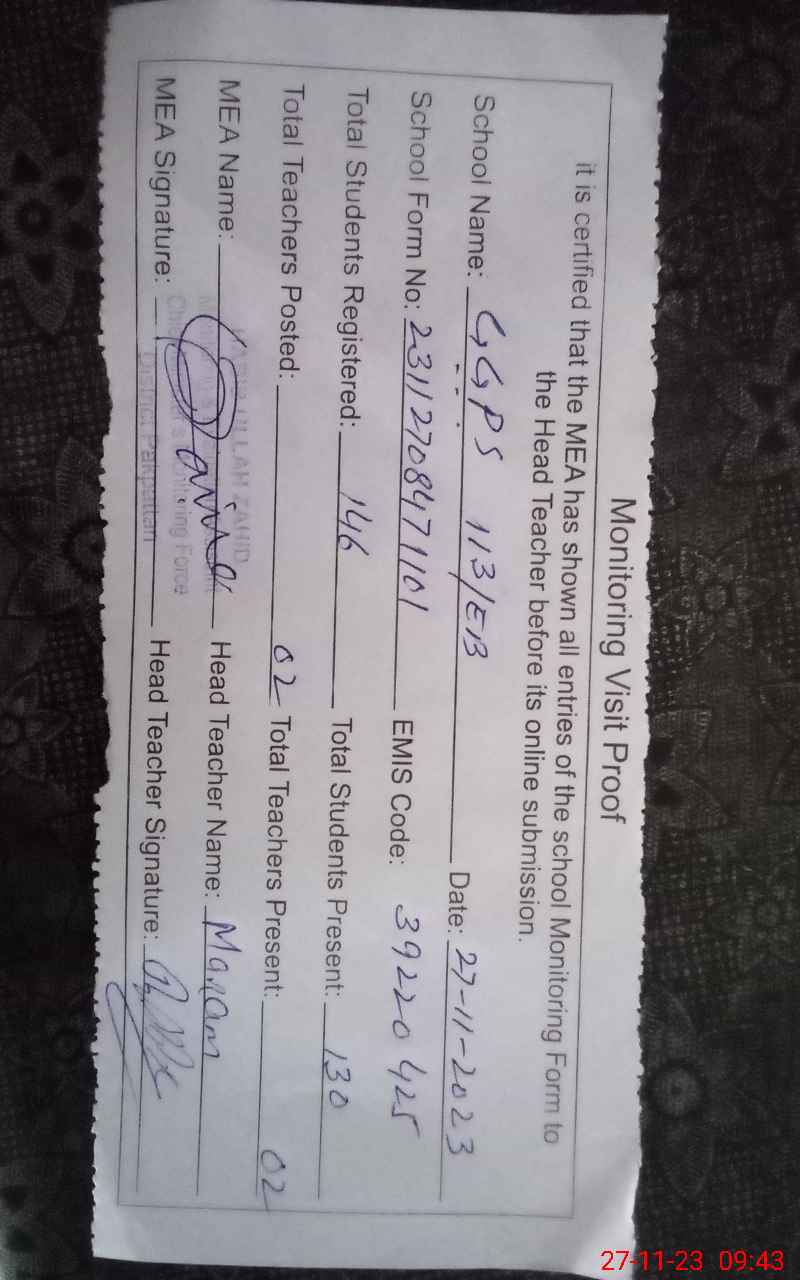 | EMIS Code: 39220425 | Name of School: GGPS 113 EB | |||