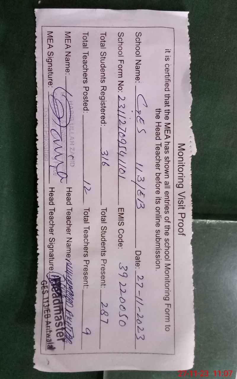 | EMIS Code: 39220050 | Name of School: GES 113 EB P/O 111 EB ARIFWALA | |||