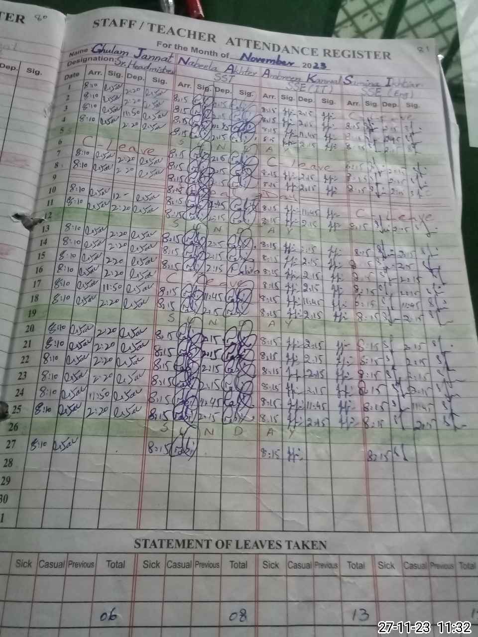 | 37**** | Na**** Ta**** | 6 | 2 | 0 | 0 | 0 | 0 | 0 | 0 | 0 | 0 | 0 | Absent (Un-Authorized) |