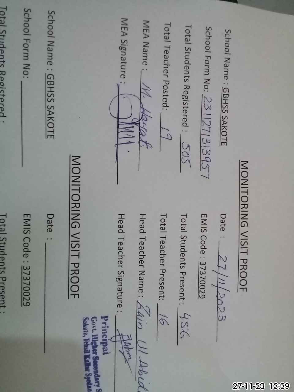 | Attendance Register | Head Teacher | MEA with School | Visit Proof |