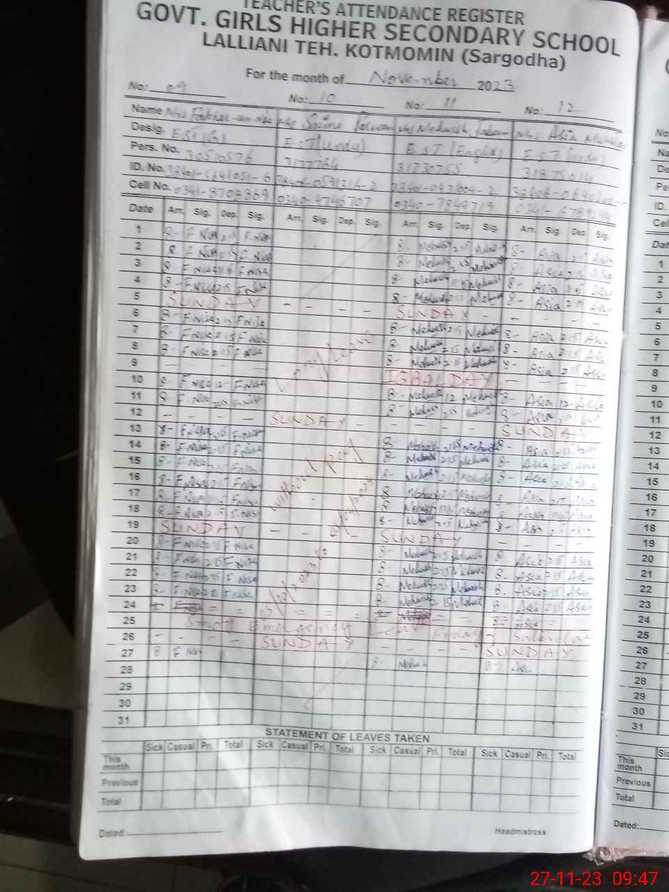 | CNIC | Full Name | Designation | R/C | Absence During Last Calender Month |
