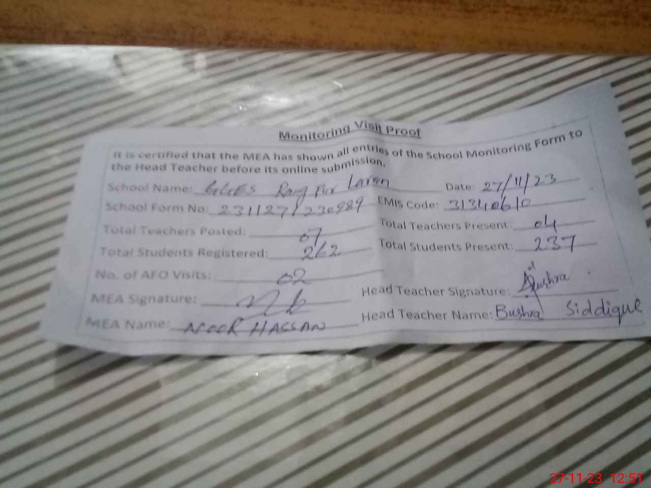 | EMIS Code: 31340610 | Name of School: GGES BASTI RANG PUR LARAN | |||