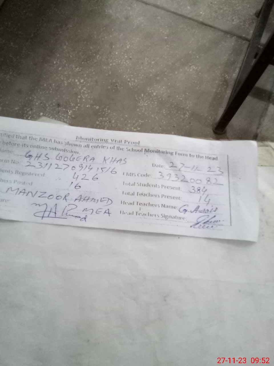 | Attendance Register | Head Teacher | MEA with School | Visit Proof |