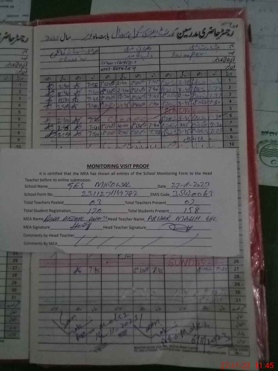 | Attendance Register | Head Teacher | MEA with School | Visit Proof |