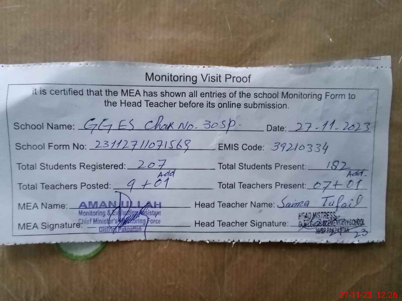| Attendance Register | Head Teacher | MEA with School | Visit Proof |