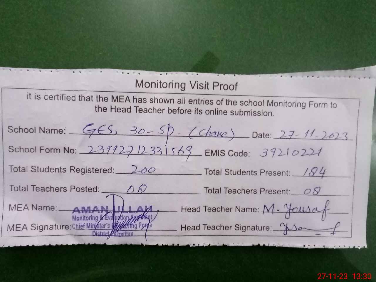 | EMIS Code: 39210221 | Name of School: GES CHAK NO. 30 SP | |||