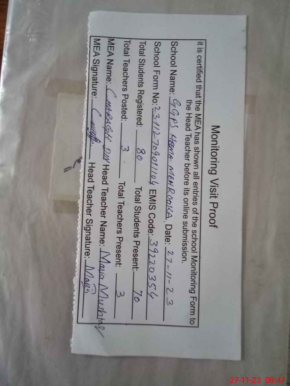 | EMIS Code: 39220354 | Name of School: GGPS HEEMAN MEHROOKA | |||