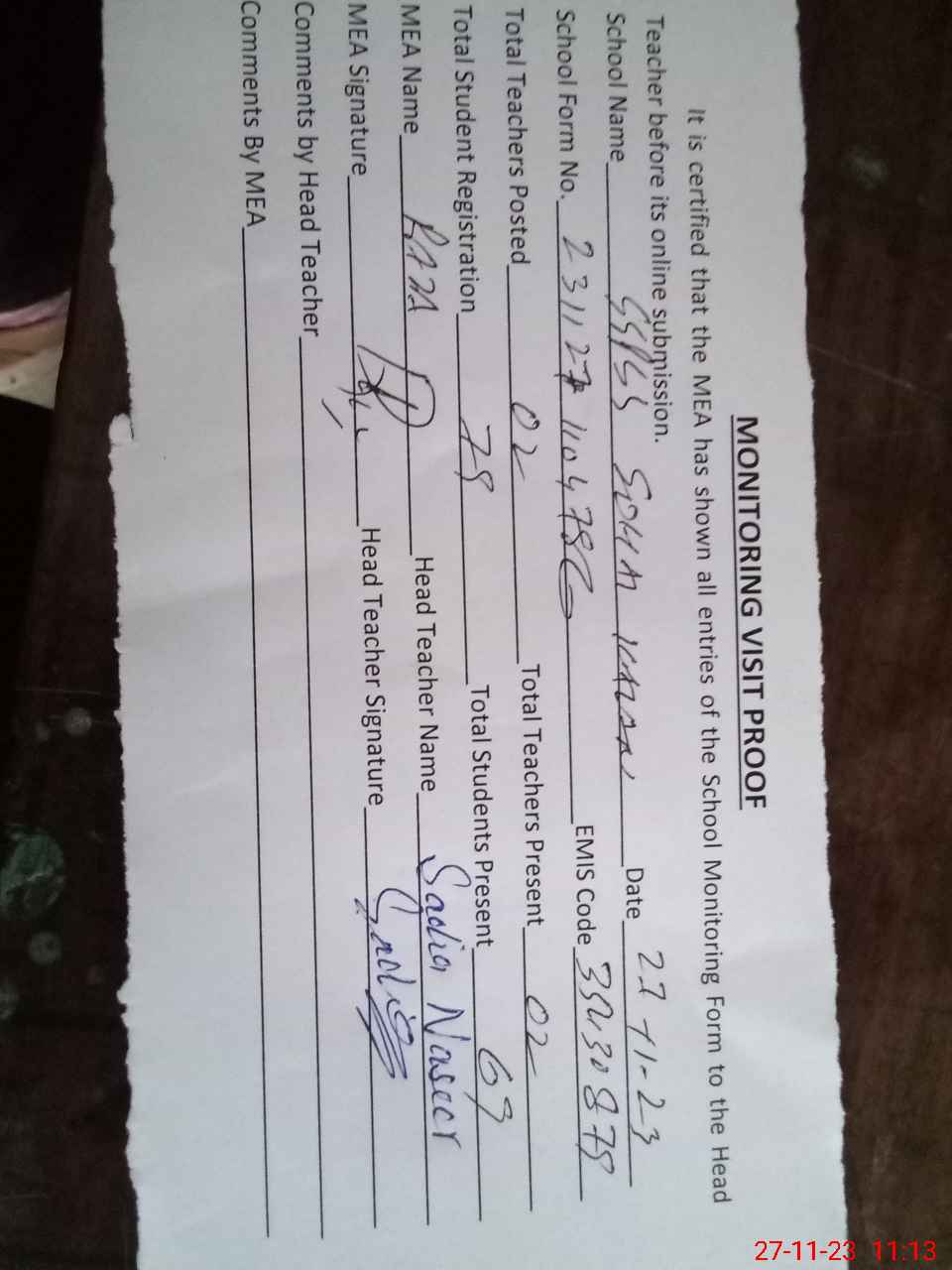 | Attendance Register | Head Teacher | MEA with School | Visit Proof |
