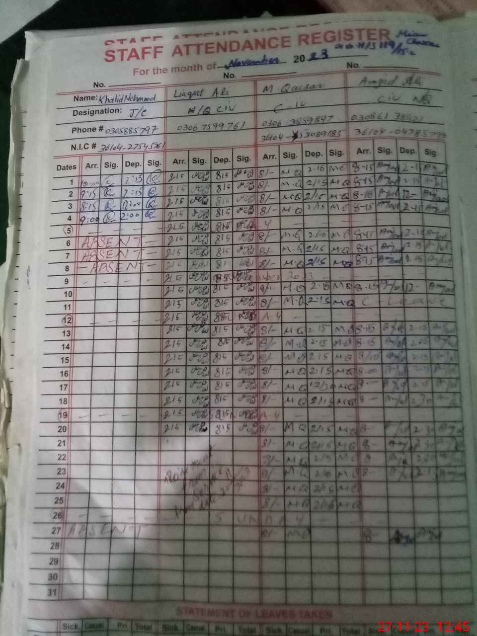 | CNIC | Full Name | Designation | R/C | Absence during last cal. month |