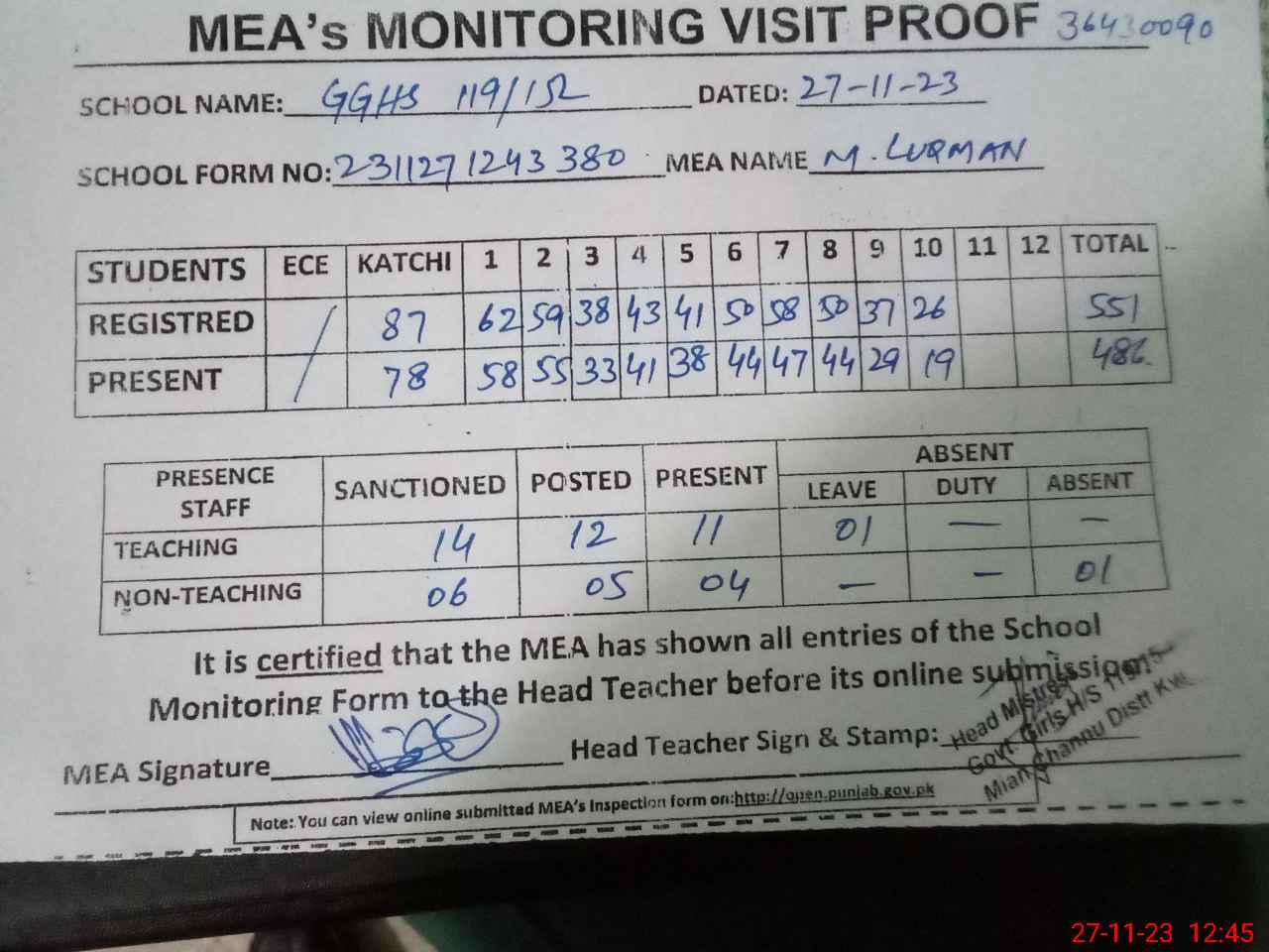 | Attendance Register | Head Teacher | MEA with School | Visit Proof |