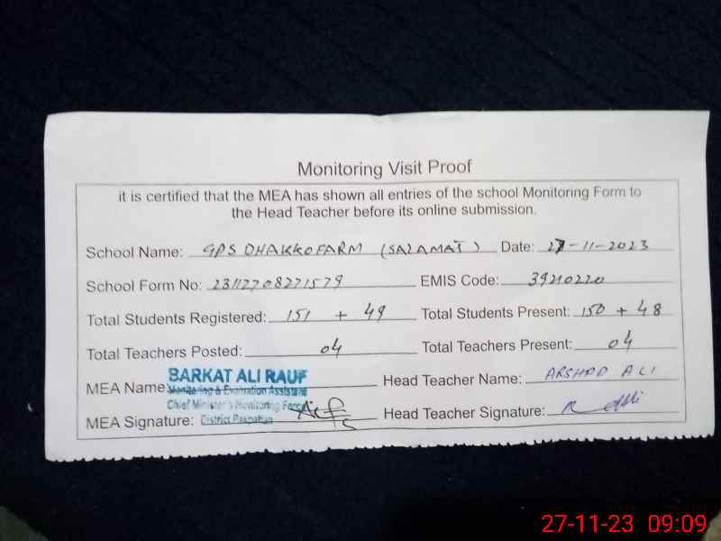 | EMIS Code: 39210220 | Name of School: GPS DHAKKO FARM CHAK NO. 36/SP SALAMAT PURA | |||