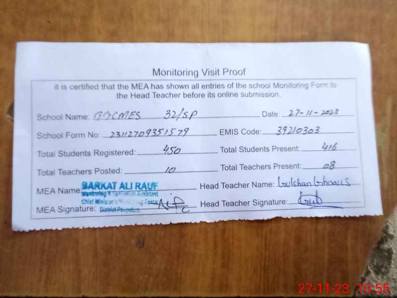 | EMIS Code: 39210303 | Name of School: GGHS CHAK NO.32 SP TABAR | |||