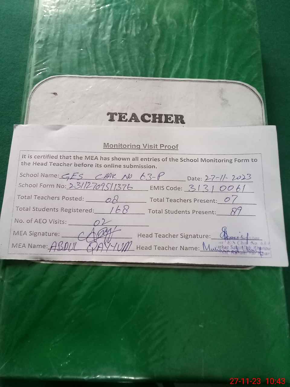 | EMIS Code: 31310061 | Name of School: GES CHAK NO 63/P | |||