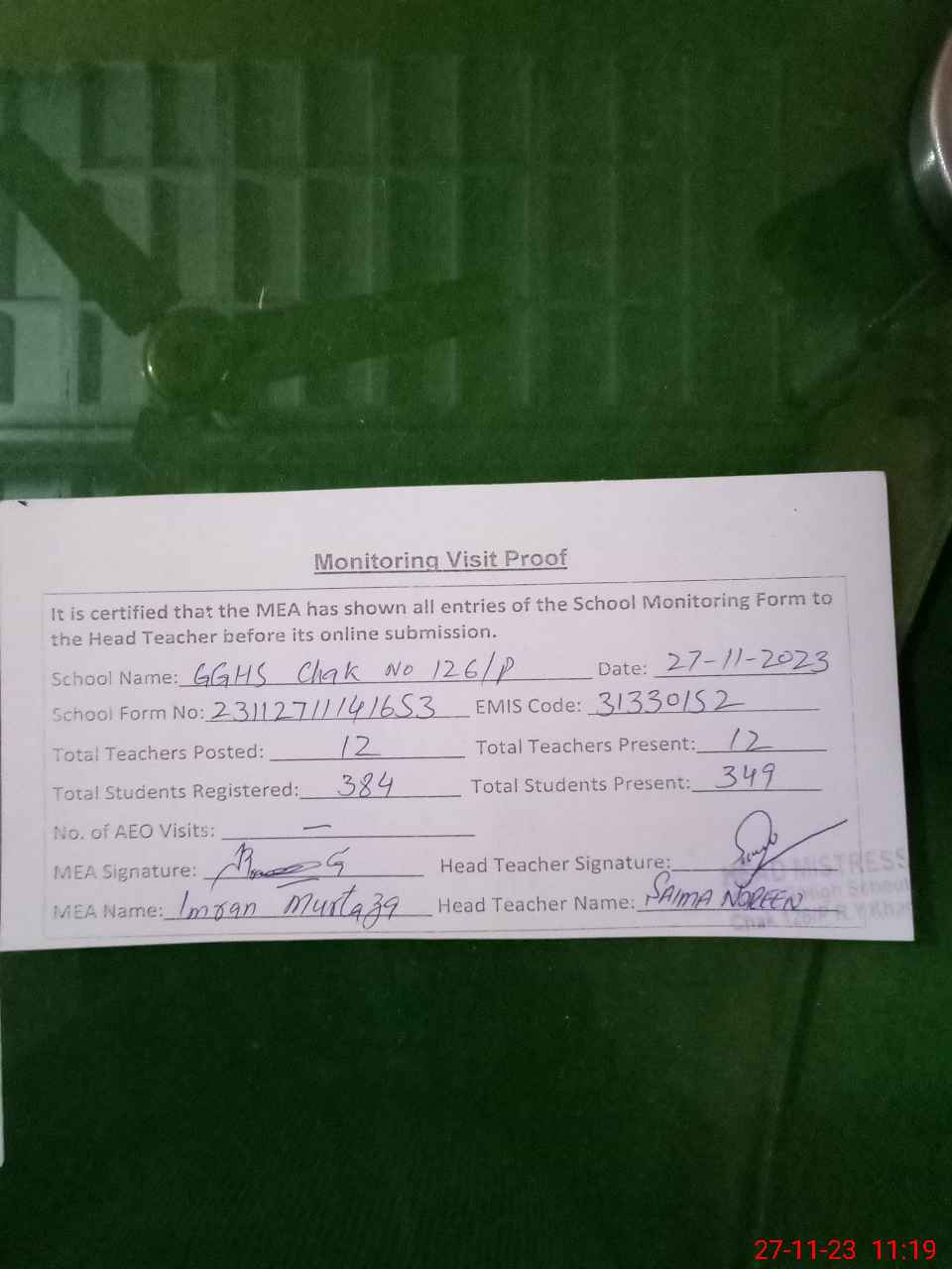 | Attendance Register | Head Teacher | MEA with School | Visit Proof |