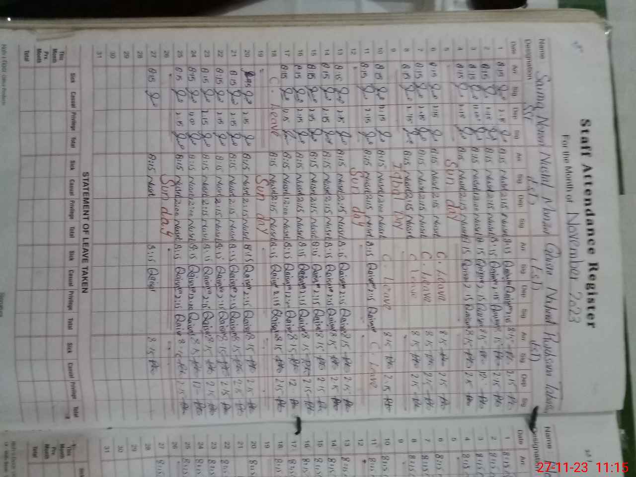 | CNIC | Full Name | Designation | R/C | Absence During Last Calender Month |