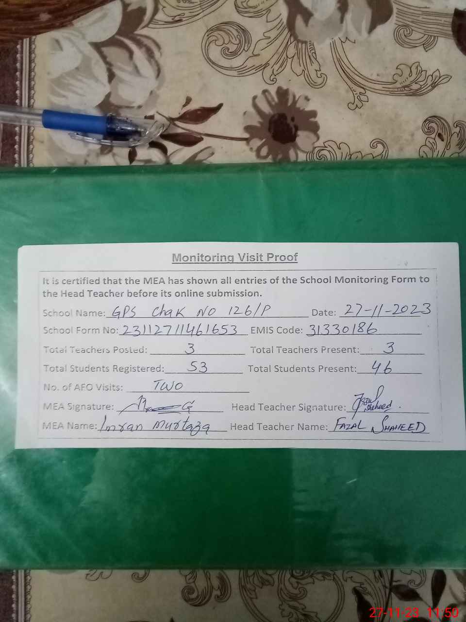 | EMIS Code: 31330186 | Name of School: GPS CHAK NO. 126/P | |||