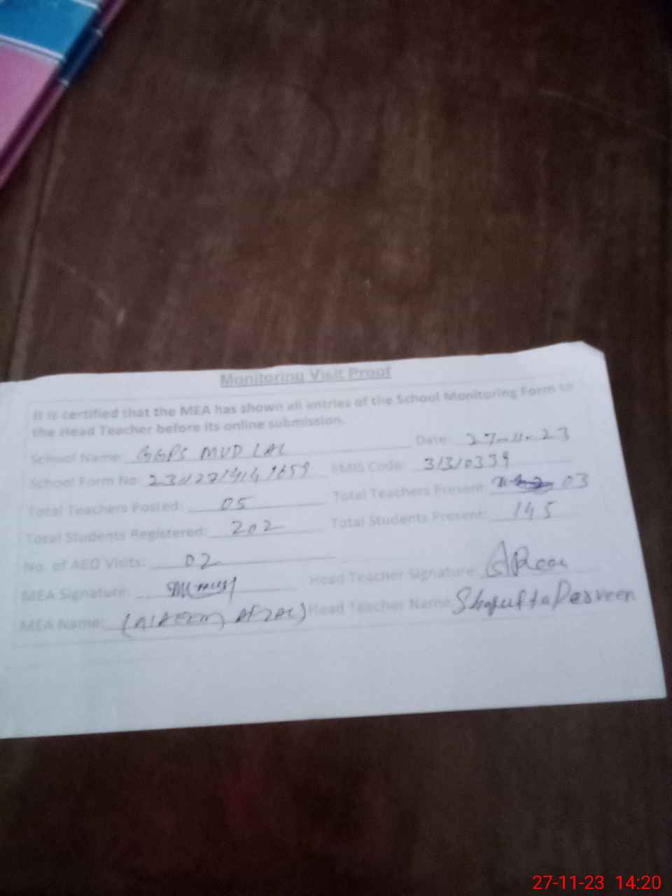 | Attendance Register | Head Teacher | MEA with School | Visit Proof |