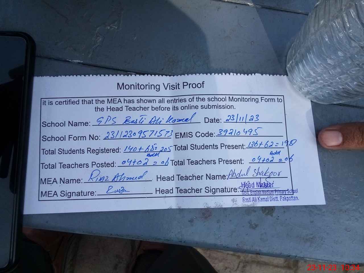 | Attendance Register | Head Teacher | MEA with School | Visit Proof |