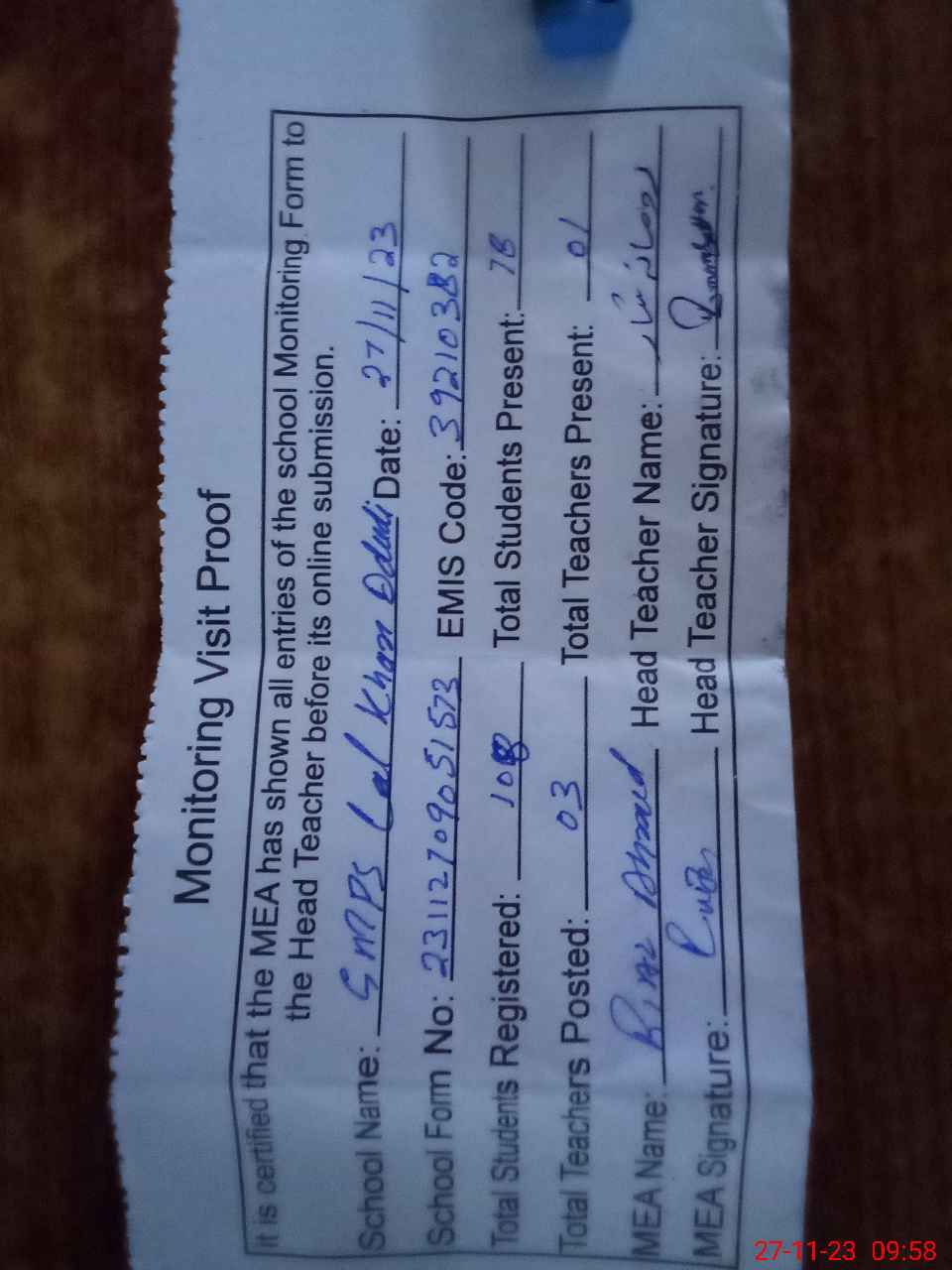 | EMIS Code: 39210382 | Name of School: GMPS LAL KHAN DHUDI | |||