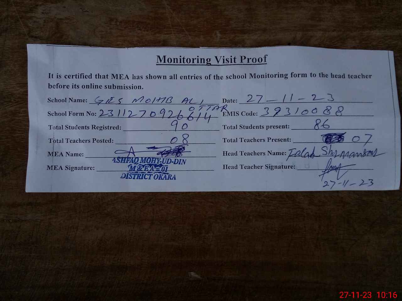 | Attendance Register | Head Teacher | MEA with School | Visit Proof |