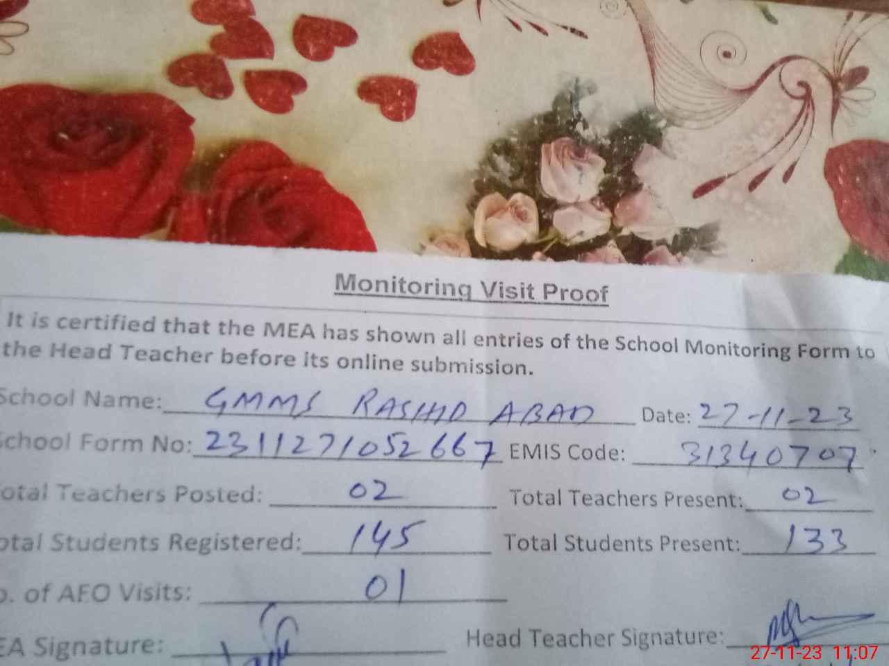 | Attendance Register | Head Teacher | MEA with School | Visit Proof |