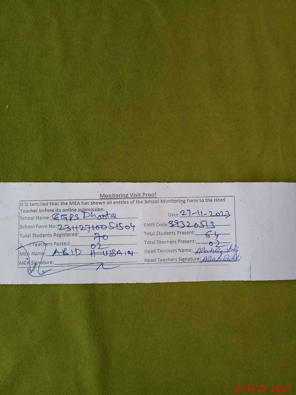 | Attendance Register | Head Teacher | MEA with School | Visit Proof |