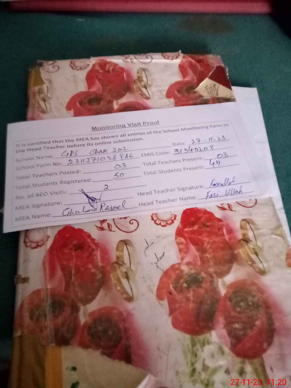 | Attendance Register | Head Teacher | MEA with School | Visit Proof |