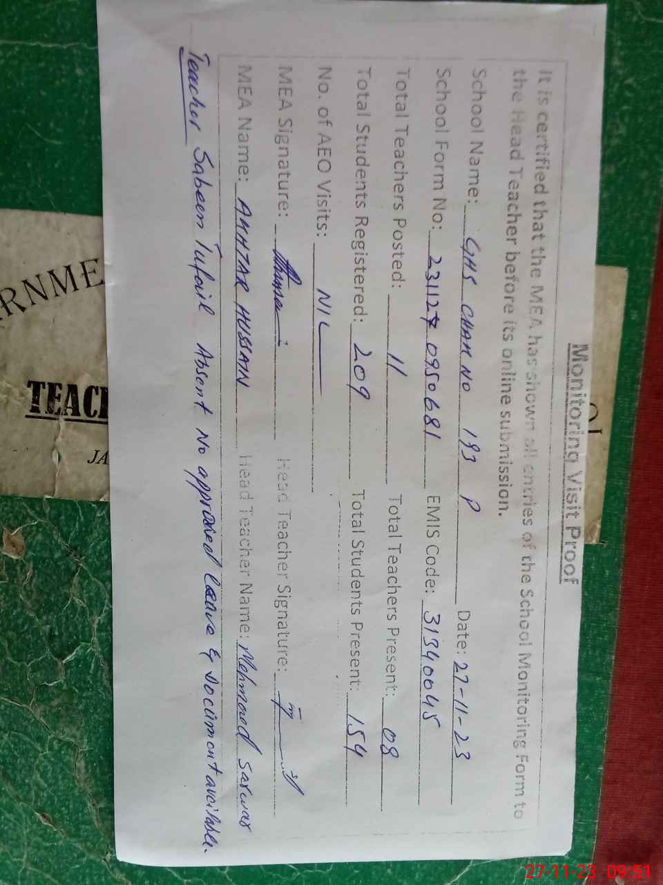 | Attendance Register | Head Teacher | MEA with School | Visit Proof |