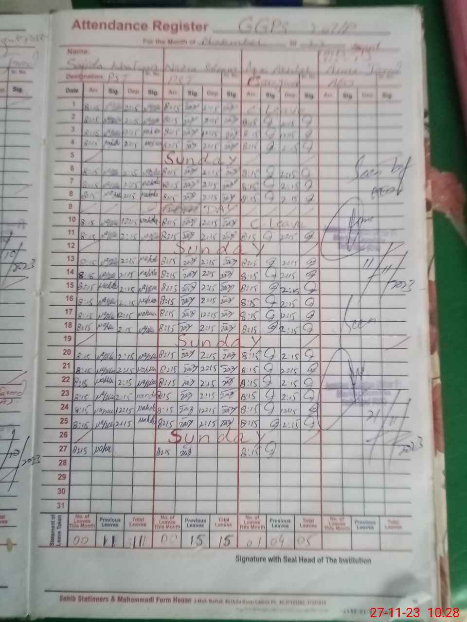 | CNIC | Full Name | Designation | R/C | Absence During Last Calender Month |
