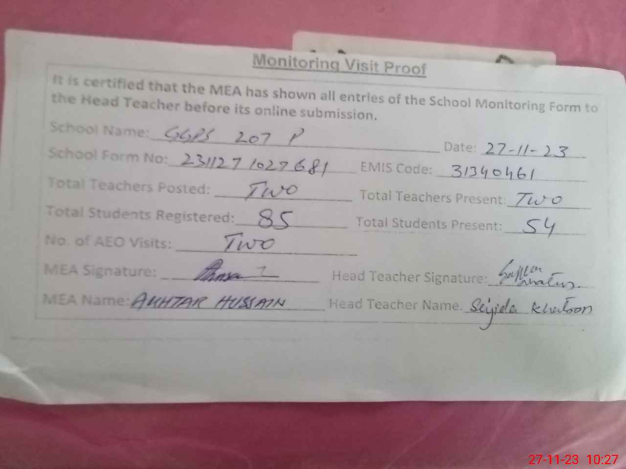 | Attendance Register | Head Teacher | MEA with School | Visit Proof |