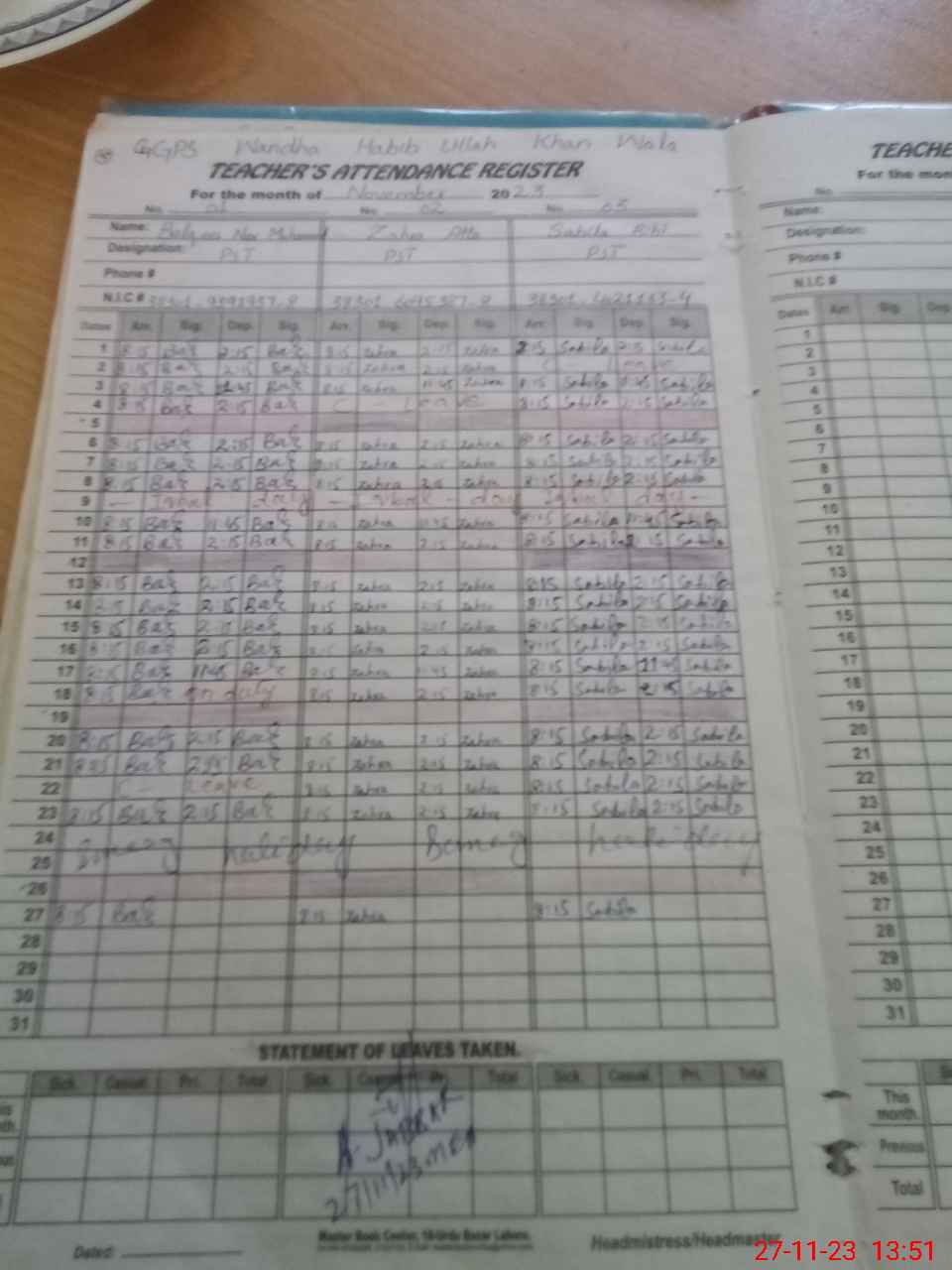 | CNIC | Full Name | Designation | R/C | Absence During Last Calender Month |