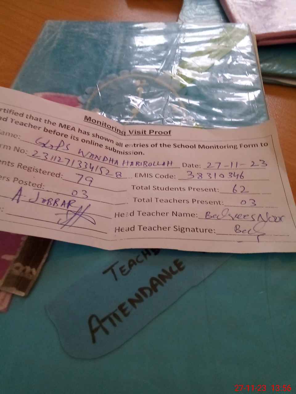 | Attendance Register | Head Teacher | MEA with School | Visit Proof |