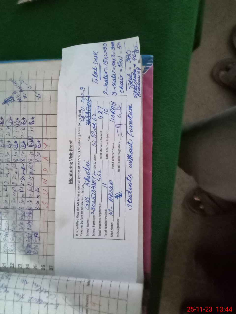| Attendance Register | Head Teacher | MEA with School | Visit Proof |