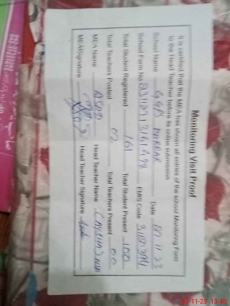 | Attendance Register | Head Teacher | MEA with School | Visit Proof |