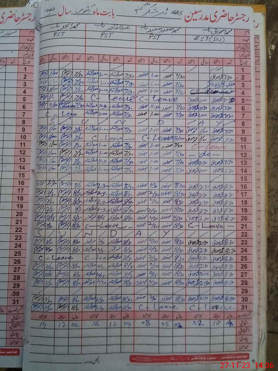 | CNIC | Full Name | Designation | R/C | Absence During Last Calender Month |