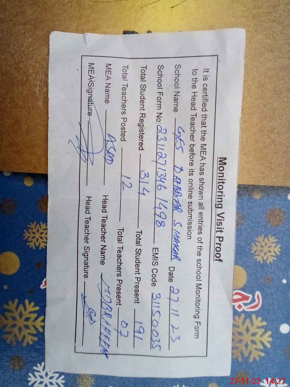 | Attendance Register | Head Teacher | MEA with School | Visit Proof |