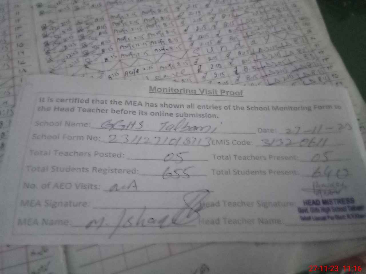 | Attendance Register | Head Teacher | MEA with School | Visit Proof |